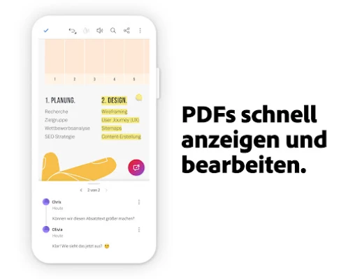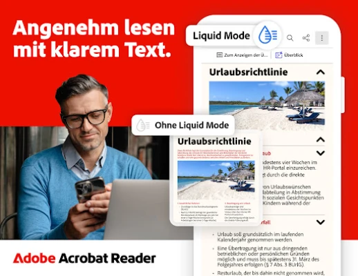Selbstverständlich bietet Acrobat Reader auch eine Fülle an kostenlosen Funktionen für den täglichen Gebrauch. Nutzen Sie Adobe Fill & Sign, um Formulare schnell auszufüllen und digital zu unterschreiben. Der innovative Liquid Mode sorgt für ein optimales Leseerlebnis, indem er das Layout an Ihr Gerät anpasst und Navigation sowie Schriftgröße flexibel gestaltet. Teilen Sie PDFs zum Kommentieren und Arbeiten Sie effektiv im Team, indem Sie Kollegen markieren und Feedback zentral verwalten. Haftnotizen, Textmarker und die Möglichkeit, wichtige Dateien zu markieren, vereinfachen Ihre Organisation. Verknüpfen Sie zudem mühelos Cloud-Speicher wie OneDrive, Dropbox und Google Drive, um jederzeit auf Ihre Dokumente zuzugreifen und nahtlos mit Adobe Scan erstellten PDFs zu arbeiten.