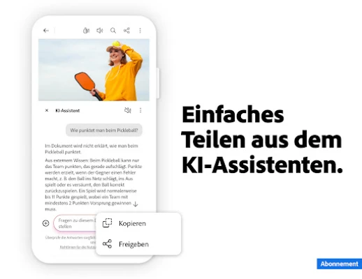 Steigern Sie Ihre Effizienz mit dem fortschrittlichen Adobe Acrobat KI-Assistent, der Ihre Arbeit mit mehreren Dateien in PDF Spaces revolutioniert. Stellen Sie per Sprache oder Text komplexe Fragen – selbst zu detaillierten Tabellen und Grafiken – und erhalten Sie präzise Antworten, die Sie direkt teilen können. Der KI-Assistent fasst PDFs zusammen, generiert Inhalte für E-Mails, Lernnotizen oder Blogs und liest Ihnen wichtige Informationen vor. Darüber hinaus bietet Acrobat Reader leistungsstarke Funktionen zur Bearbeitung von Text und Bildern direkt in Ihrer PDF, eine Texterkennung (OCR) für gescannte Dokumente sowie umfassende Werkzeuge zum Zusammenfügen, Organisieren, Komprimieren und Passwortschutz Ihrer PDFs. Testen Sie diese und viele weitere Premium-Funktionen jetzt sieben Tage lang kostenfrei.