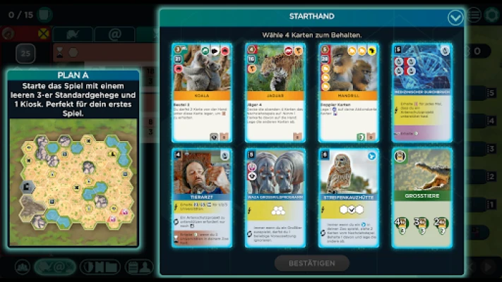 Im Kern Ihres strategischen Managements stehen fünf flexible Aktionskarten, die Sie im Laufe des Spiels kontinuierlich verbessern können. Ihre Wirksamkeit hängt entscheidend von ihrer aktuellen Position ab, was jeder Entscheidung eine zusätzliche taktische Ebene verleiht. Mit der Aktion 'Bauen' errichten Sie nicht nur Standardgehege, sondern auch spezialisierte Lebensräume, Kioske und Informationspavillons. 'Tiere' ermöglicht Ihnen die Ansiedlung neuer Bewohner, während 'Karten' den Zugang zu frischen Tier-, Sponsoren- und Naturschutzprojekt-Karten sichert. Nutzen Sie 'Verband', um Ihre Verbandsmitarbeiter auf wichtige Missionen zu entsenden, und 'Sponsoren', um wertvolle Unterstützung zu erhalten oder finanzielle Mittel zu generieren.