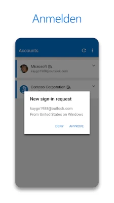 Microsoft Authenticator macht die Anmeldung bei Ihrem Microsoft-Konto einfach und sicher. Nutzen Sie Ihr Telefon anstelle eines Kennworts. Geben Sie Ihren Benutzernamen ein und genehmigen Sie die Benachrichtigung. Diese Zwei-Schritt-Verifizierung schützt Ihre Daten mit Fingerabdruck, Face ID oder PIN und gewährt sicheren Zugriff auf Outlook, OneDrive und Office.