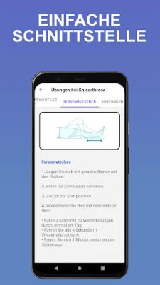 Diese Anwendung wurde konzipiert, um Ihnen einen strukturierten Weg zur Kniestärkung und Schmerzlinderung zu bieten. Sie enthält eine sorgfältig zusammengestellte Auswahl an Übungsprogrammen, die einfach in den Alltag zu integrieren sind. Entdecken Sie spezifische Übungen, die auf die Bedürfnisse bei Kniearthrose zugeschnitten sind, sowie umfassende Anleitungen zur allgemeinen Kniestärkung und zur Förderung der Erholung. Mit speziellen Trainingsmodulen zum Knieschutz und detaillierten Informationen rund um das Thema Knieschmerzen erhalten Sie ein ganzheitliches Werkzeug, um Ihre Kniegesundheit proaktiv zu unterstützen.
