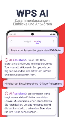 WPS AI befreit Sie auch von der Last langer PDF-Dokumente. Führen Sie interaktive Gespräche mit Ihren PDFs, um sofort präzise Antworten zu erhalten, oder lassen Sie WPS AI mühelos Zusammenfassungen, Gliederungen und Übersetzungen erstellen. Darüber hinaus transformiert die KI-gesteuerte OCR-Technologie von WPS AI die Dateneingabe, indem sie gescannte Dokumente in verwertbare Informationen umwandelt und wertvolle Einblicke liefert. Doch WPS Office ist mehr als nur künstliche Intelligenz; es ist ein leistungsstarkes Office-Paket, das die Erstellung, Bearbeitung und gemeinsame Nutzung von Word-, Tabellenkalkulations- und Präsentationsdateien auf Ihrem Android-Gerät intuitiver denn je macht.